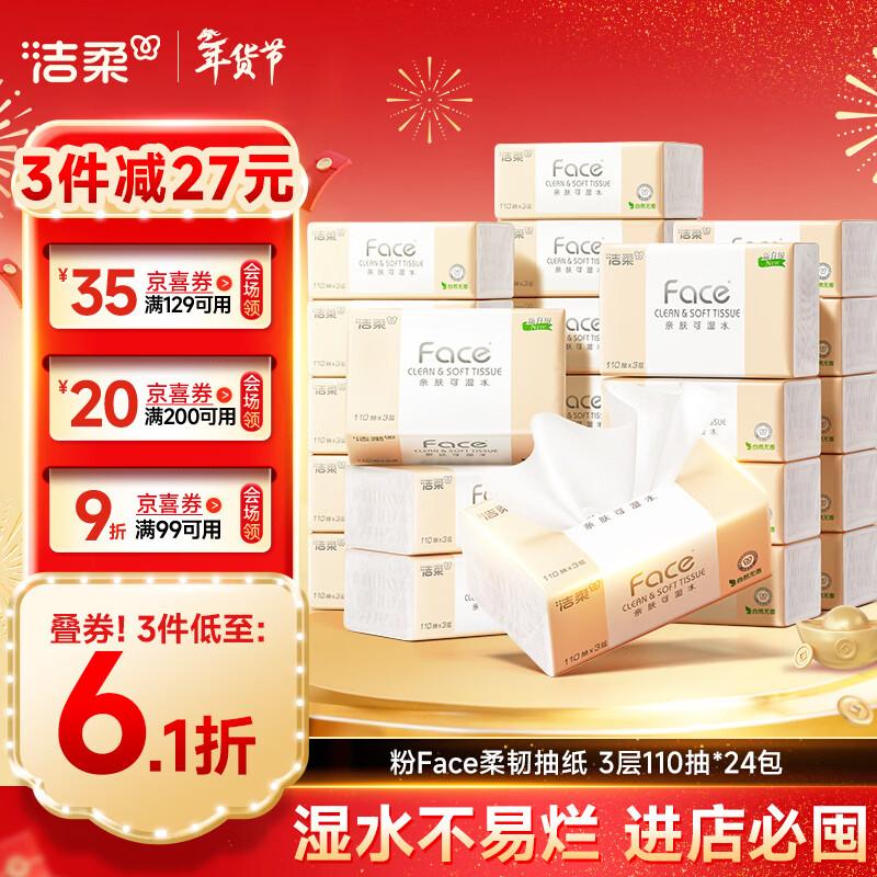 自营洁柔抽纸 粉Face柔韧3层110抽*24包 可湿水纸巾卫生纸 抽纸整箱