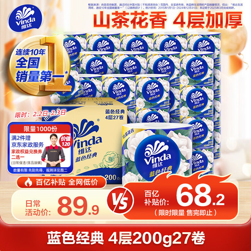 自营维达(Vinda)有芯卷纸 蓝色经典4层200克*27卷 山茶花香 卫生纸卷筒纸纸巾整箱