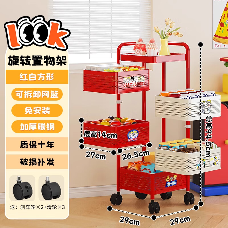 旗舰店雅图诗多巴胺小推车零食置物架移动落地摆放架家用客厅厨房多层收纳架子 【免安装】方形五层+赠11张贴纸