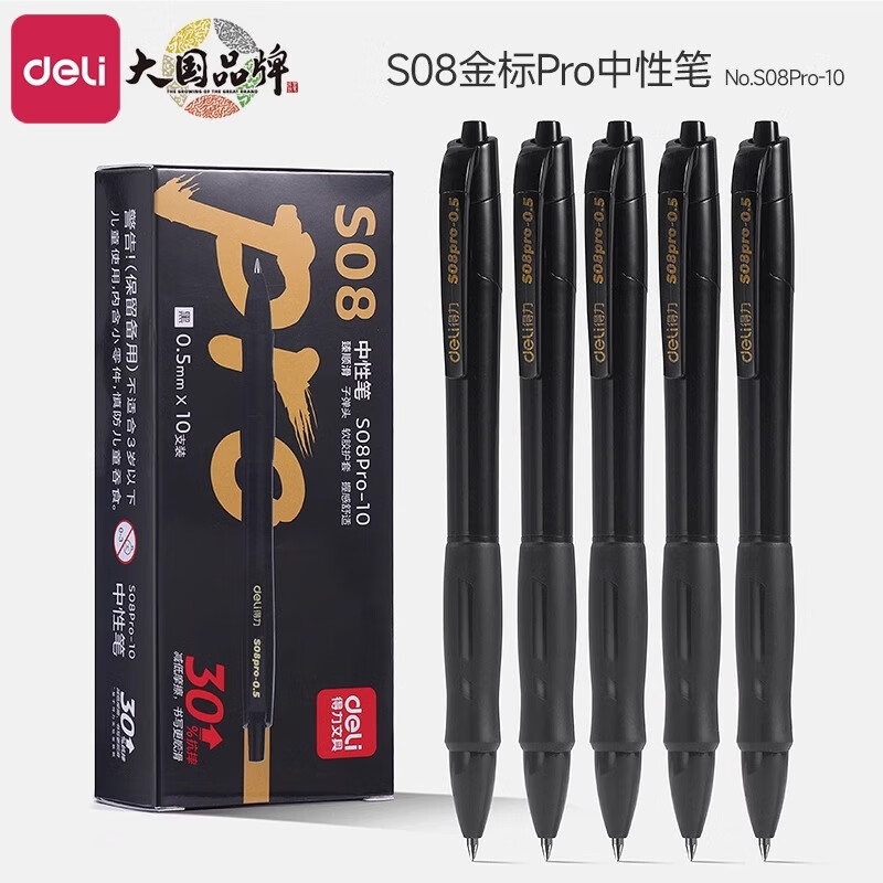 旗舰店得力臻顺滑s08pro按动中性笔子弹头黑色0.5mm刷题笔水笔圆珠笔速干笔学生初中专用签字碳素笔高级 【臻顺滑S08pro】3支/黑色