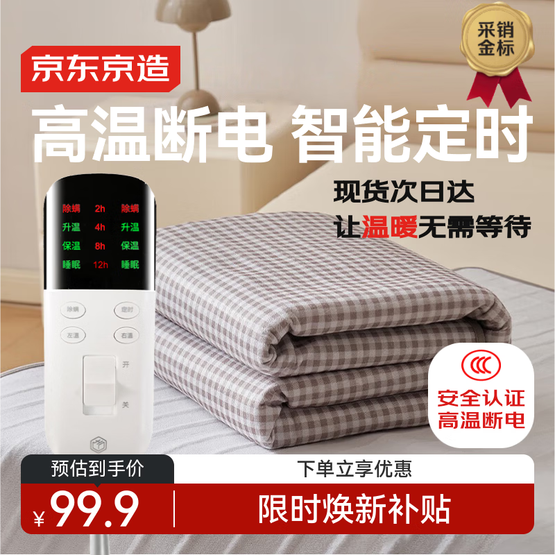 自营京东京造【高温断电】双人定时双温双控除螨电热毯电褥子-双人1.5x1.8m