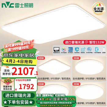 旗舰店雷士(NVC)LED普瑞全光谱吸顶灯小白灯简约奶油风客厅卧室灯具智能RGO-白雪 【IP50普瑞】四室一厅