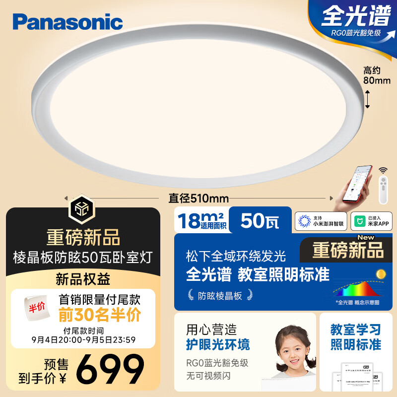 自营松下(Panasonic)吸顶灯全光谱智能护眼棱晶板客厅灯50瓦防尘防虫HHXS5430