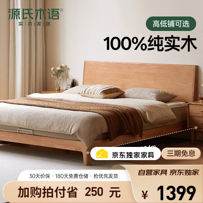 自营源氏木语实木床现代简约斜靠背双人床北欧小户型主卧大床原木色低铺1.5*2m