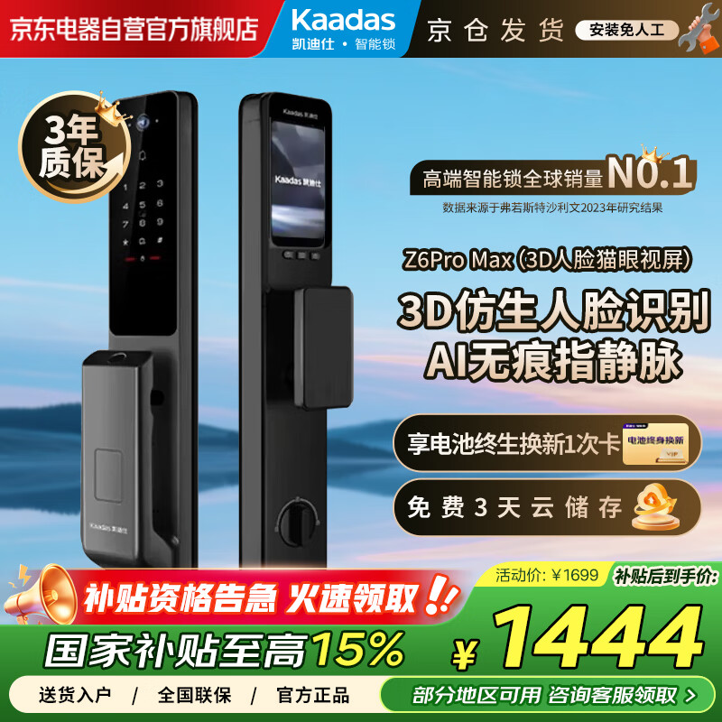 自营凯迪仕(kaadas)指静脉3D人脸识别电子密码指纹智能锁 Z6ProMax【Q3FVP升级】