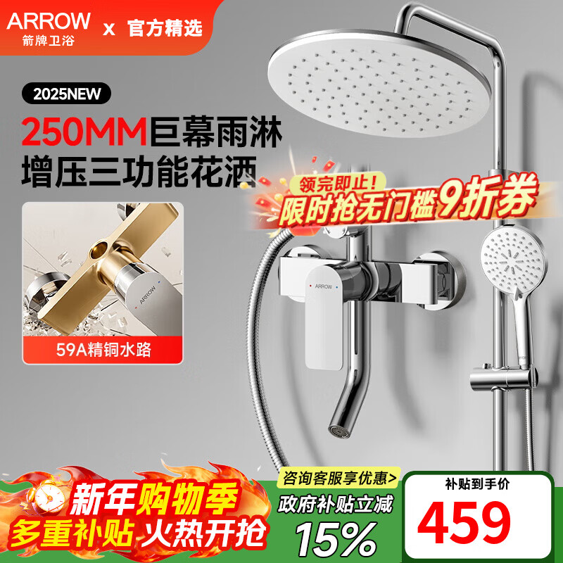 百亿补贴箭牌(ARROW)【焕新补贴】花洒全套精铜龙头淋浴花洒套装花洒全套莲蓬头淋浴器 【A款银色】圆顶增压三功能-AE33204