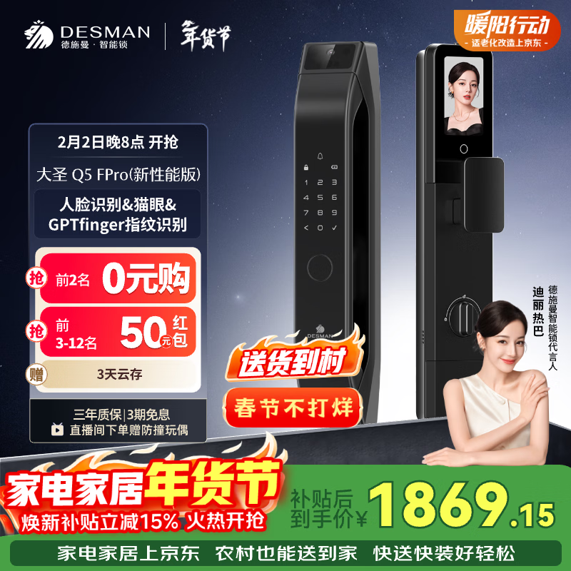 自营德施曼(DESMAN)智能门锁C级锁芯人脸识别大屏密码电子锁大圣Q5FPro(新性能版)