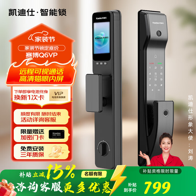 百亿补贴凯迪仕电子锁智能锁指纹密码锁上门安装家用防盗入户门实时监控远程控制 Q6VP-远程可视通话高清猫眼内屏