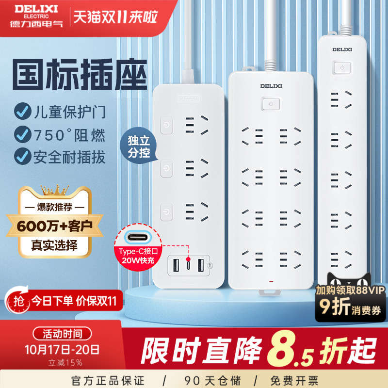 旗舰店德力西接线板排插托拖线板新国标插线板插排家用多功能插头转换器