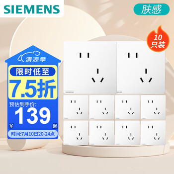 自营西门子(SIEMENS)插座面板套装 斜五孔10只量贩装 86型暗装电源插座 皓彩雅白