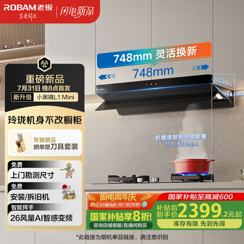 自营老板(Robam)【超薄平嵌小黑镜61A9S】26风量抽吸排油烟机顶侧一体家用小尺寸大吸力以旧换新可搭燃气灶L1mini