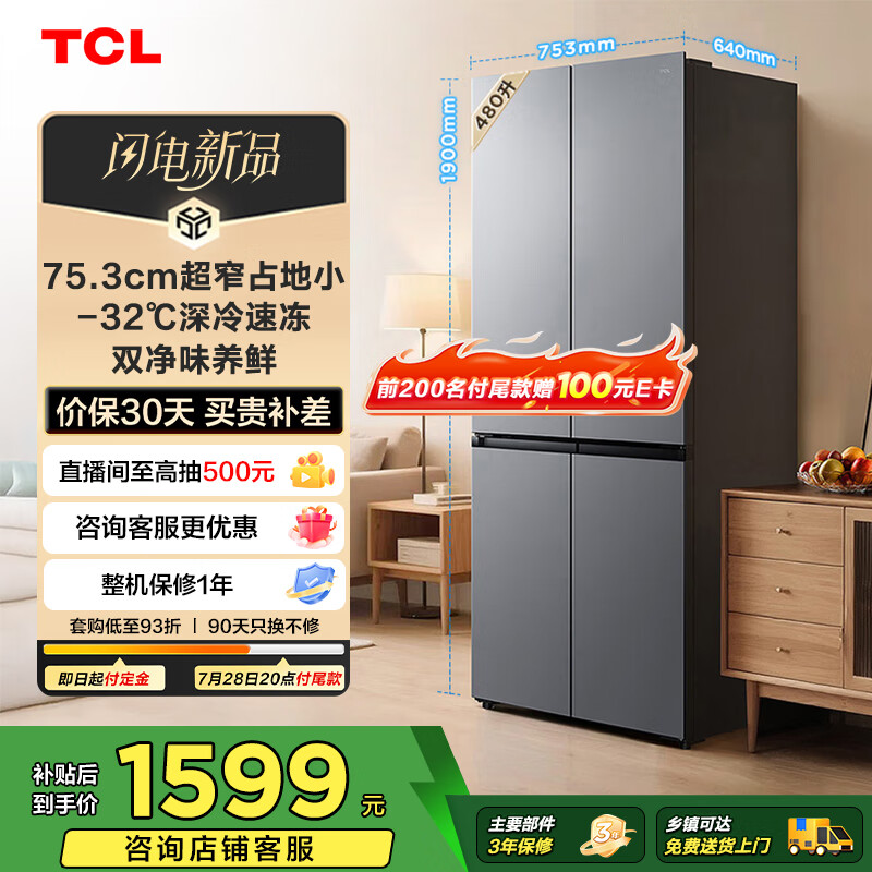 自营TCL 480升V7十字对开双开四开门超窄小户型大容量净味抗菌深冷速冻家用冰箱一级能效风冷无霜R480V7-U