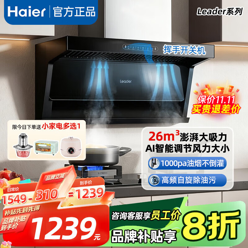 旗舰店海尔【热销中】抽油烟机26立方大风量大吸力7字型家用顶侧双吸三吸油烟机燃气灶套装变频Leader系列 【单烟机】26m³大吸力+1000pa静压