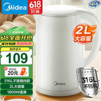 旗舰店美的(Midea)【国家补贴】2L大容量电热水壶 1800W家用快速沸腾电水壶烧水壶 不锈钢无缝内胆双层防烫热水壶 2L 【316L不锈钢】SH20M320-PRO