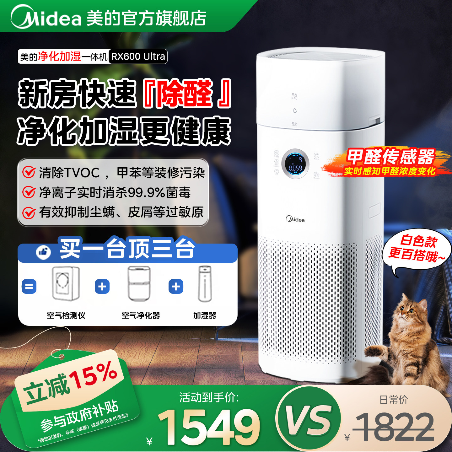旗舰店美的家用空气净化器加湿除甲醛除异味吸猫毛净化机RX600U