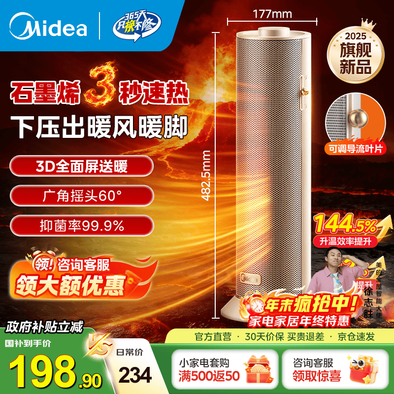 旗舰店美的(Midea)直流变频家用办公室暖风机取暖器 小型电暖器电暖气 电热风扇节能小太阳暖脚神器 新品升级石墨烯 【25年新品】石墨烯速热+抗菌
