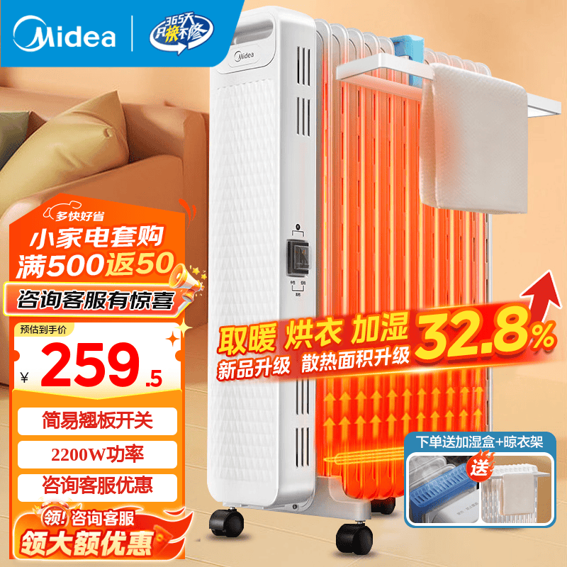 旗舰店美的(Midea)取暖器电热油汀 家用电暖器电暖气片 暖风机家用大面积30平方全屋速热加湿烘衣节能省电取暖神器 13片 【简易翘板开关】全屋暖不干燥