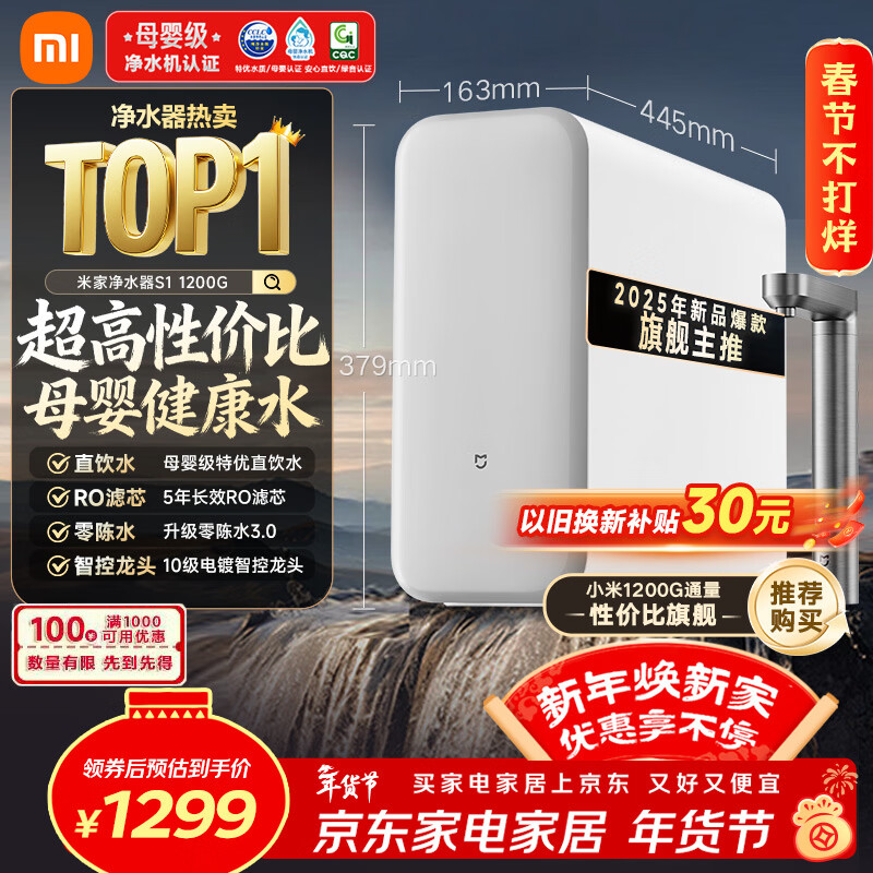 自营米家小米厨下净水器S1 1200G 5年长效RO 母婴特优水质 智能家用大通量厨房专用台下用净水机MR1272-A