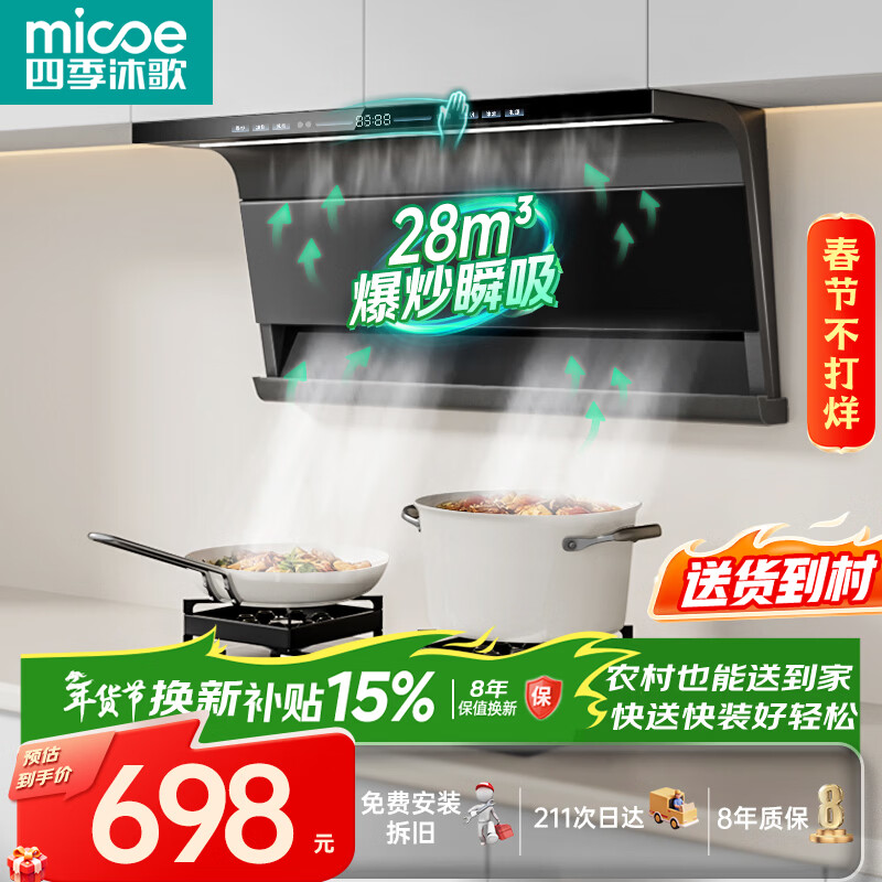 自营四季沐歌抽油烟机家用28m³大吸力顶侧双吸超薄吸油烟机一级能效免拆热清洗 挥手智控 国家补贴立减20%
