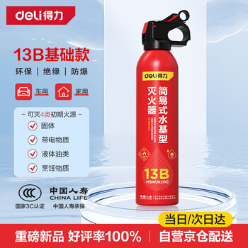 自营得力车载灭火器水基13B灭火器汽车家用国家消防3C认证环保620ml