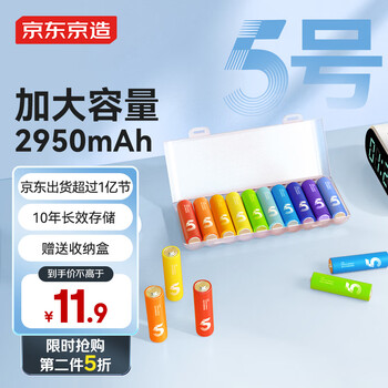 自营京东京造 5号电池10节送收纳盒 五号电池彩虹碱性超性能环保无铅汞 血压计/血糖仪/遥控器/挂钟/ 指纹锁