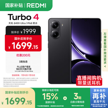 自营小米 REDMI Turbo 4 国家补贴 天玑 8400-Ultra IP68防水 16GB+256GB 暗影黑 【Turbo 4 Pro新品上市】
