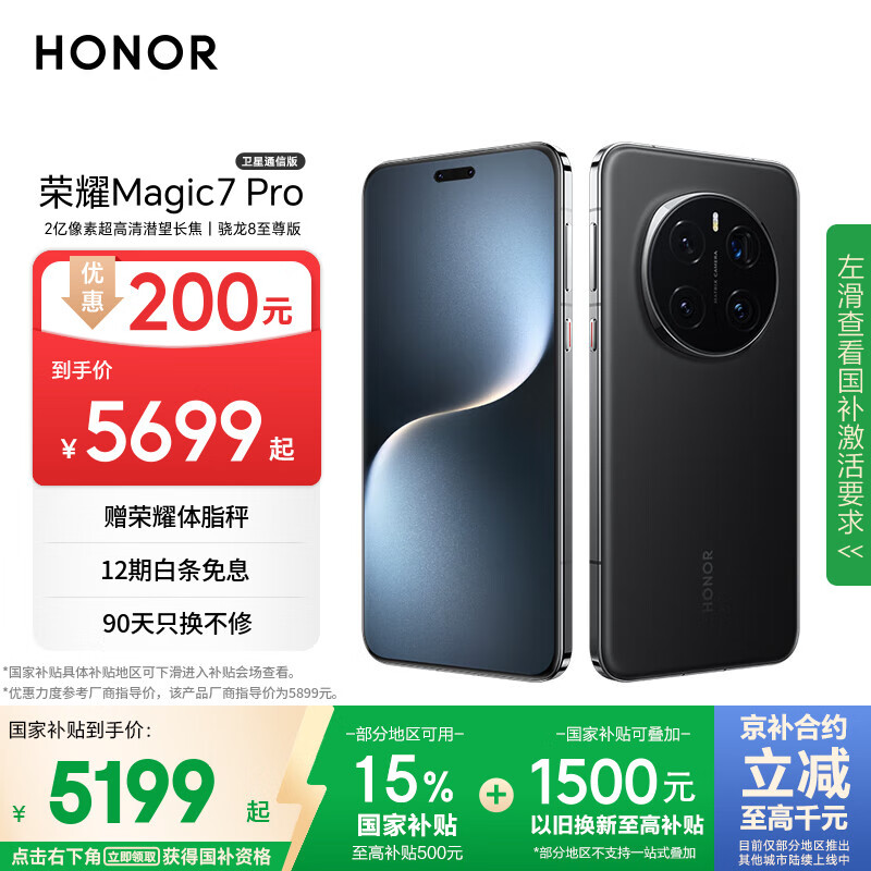 自营荣耀Magic7 Pro 卫星通信版 2亿像素超高清潜望长焦 骁龙8至尊版 16+512 绒黑色 国家补贴 5G AI手机