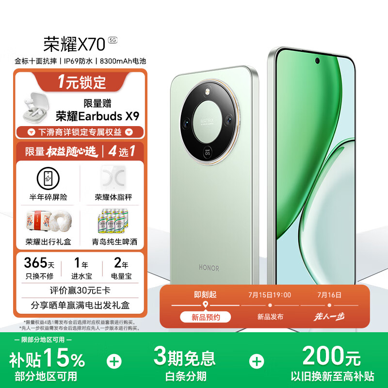 自营荣耀X70 12GB+512GB 竹韵青 购一元权益包锁定限量荣耀Earbuds X9蓝牙耳机 7月15日 新品发布