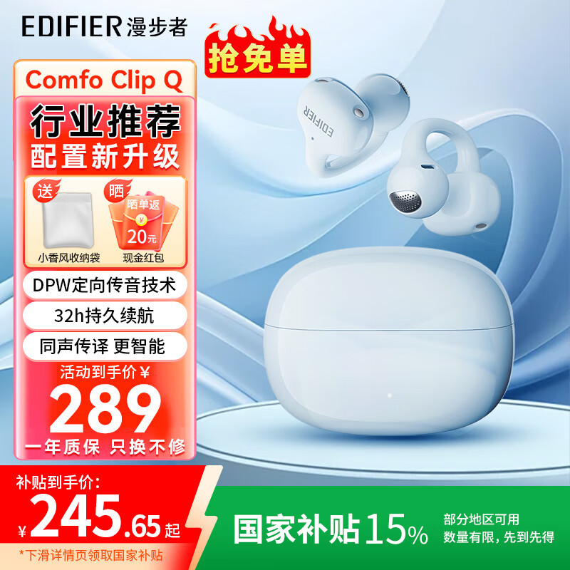 旗舰店漫步者(EDIFIER)qq耳夹Comfo Clip Q蓝牙耳机耳夹式不入耳 开放式运动耳机 骨传导概念 送礼节日礼物 【清凉一夏】海盐蓝 入会减5元 官方标配