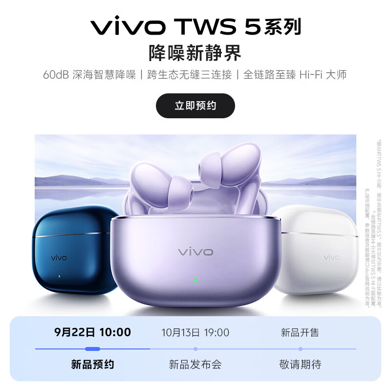 自营vivo TWS 5 降噪新静界 10月13日新品发布会 敬请期待 蓝牙耳机
