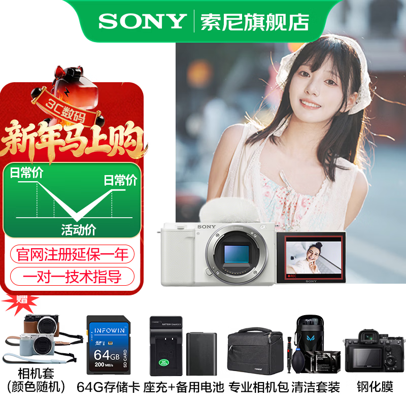 旗舰店索尼(SONY)ZV-E10K APS-C半画微单 ZV-E10 vlog直播4K视频侧翻式ZV-E10L/zv-e10/ZV-E10K 白色拆单机【64G+皮套+电+充+屏+清+D11】 官方标配(不含内存卡)