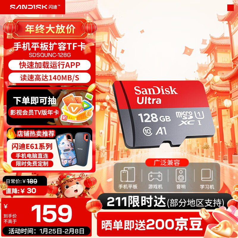 百亿补贴闪迪(SanDisk)TF卡 监控内存卡行车记录仪存储卡手机内存MicroSD卡 至尊高速 128G 140MB/S A1