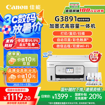 自营佳能(Canon)G3891无线可加墨自动双面彩色触摸屏一体机(打/复/扫/双频WiFi 支持5G 微信远程 学生/家用/办公)
