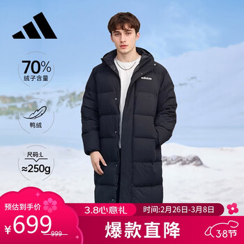 自营阿迪达斯 (adidas)长款羽绒服男女同款鸭绒连帽保暖时尚潮流外套 L码