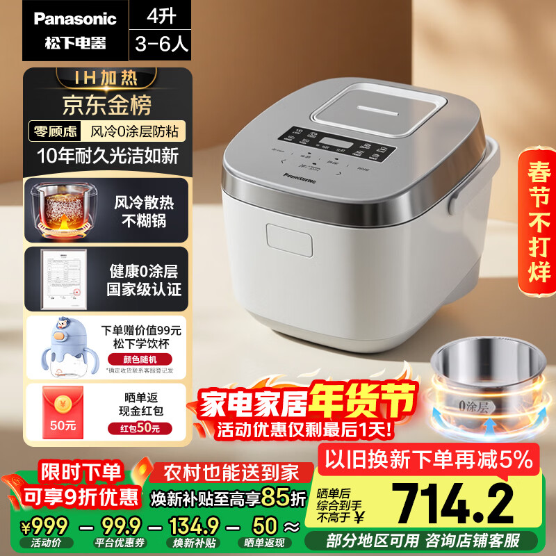 自营松下(Panasonic)【国家补贴】Xtra零零煲电饭煲0涂层IH家用无涂层电饭锅4-5人不锈钢胆4升一级能效SR-HFS153C-W