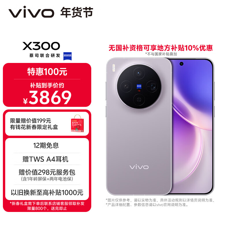 自营vivo X300 12GB+256GB 惬意紫 【地方补贴专享版】蔡司2亿超级主摄 蔡司APO超级长焦 拍照 AI手机
