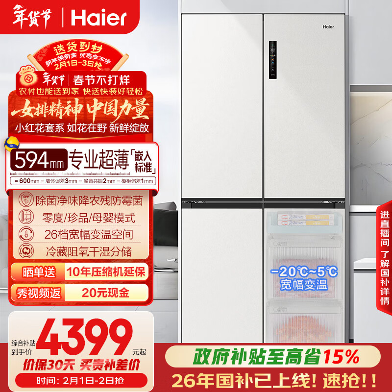 自营海尔(Haier)小红花516L十字门母婴冰箱594mm超薄零嵌除菌净味降农残防霉菌变温BCD-516WGHTDB9GPU1国家补贴