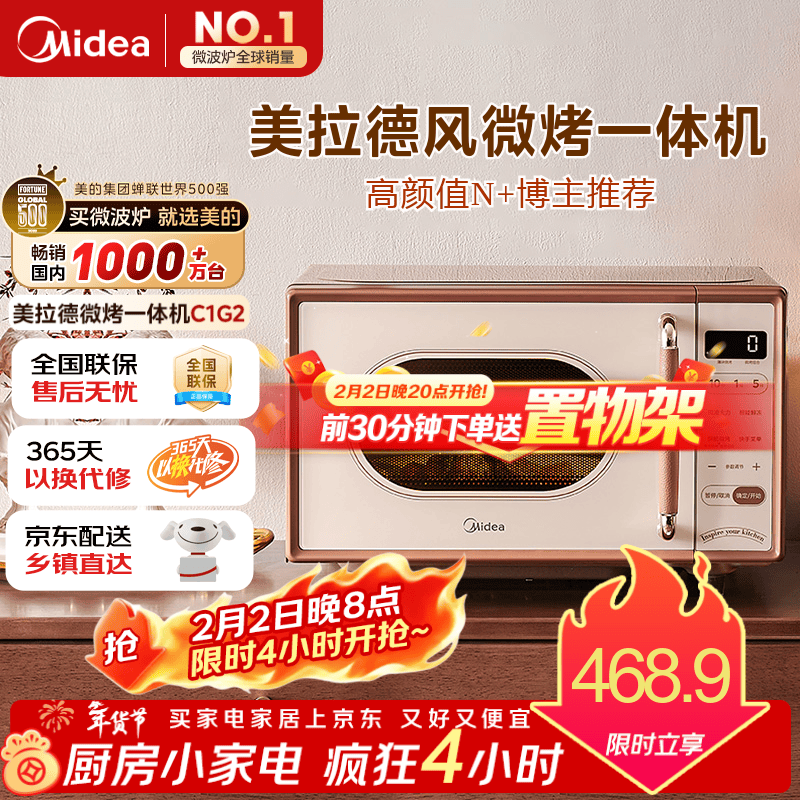 自营美的(Midea)小滋味微波炉烤箱一体机小型家用微波炉光波加热一级能效平板变频复古美拉德风C1G2