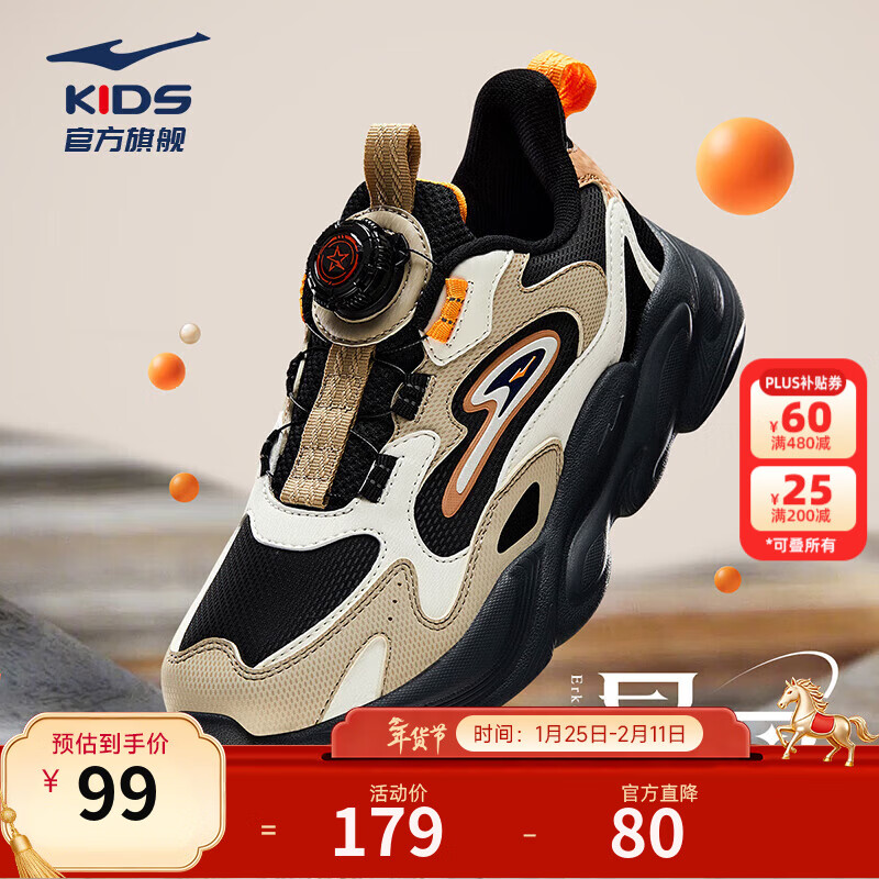 旗舰店鸿星尔克男童运动鞋女童冬季革面休闲鞋户外跑鞋儿童运动鞋丨晨星 正黑/浅亚麻-偏小1码 38