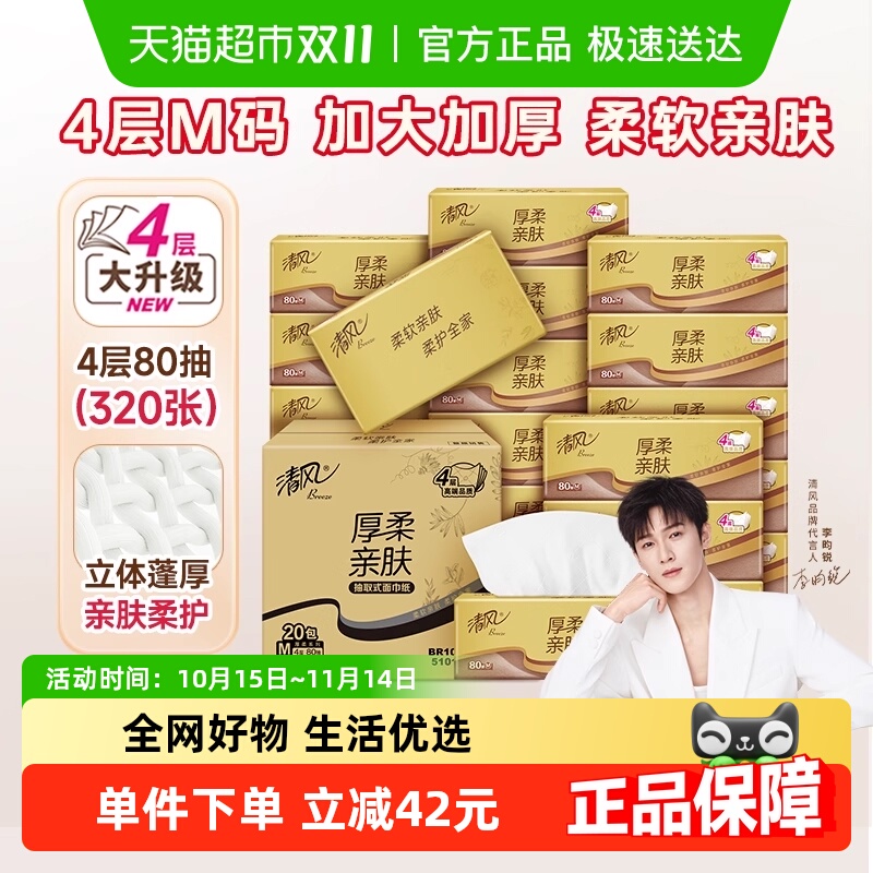 清风抽纸金装厚柔系列4层M码餐巾纸面巾纸餐巾纸纸巾整箱