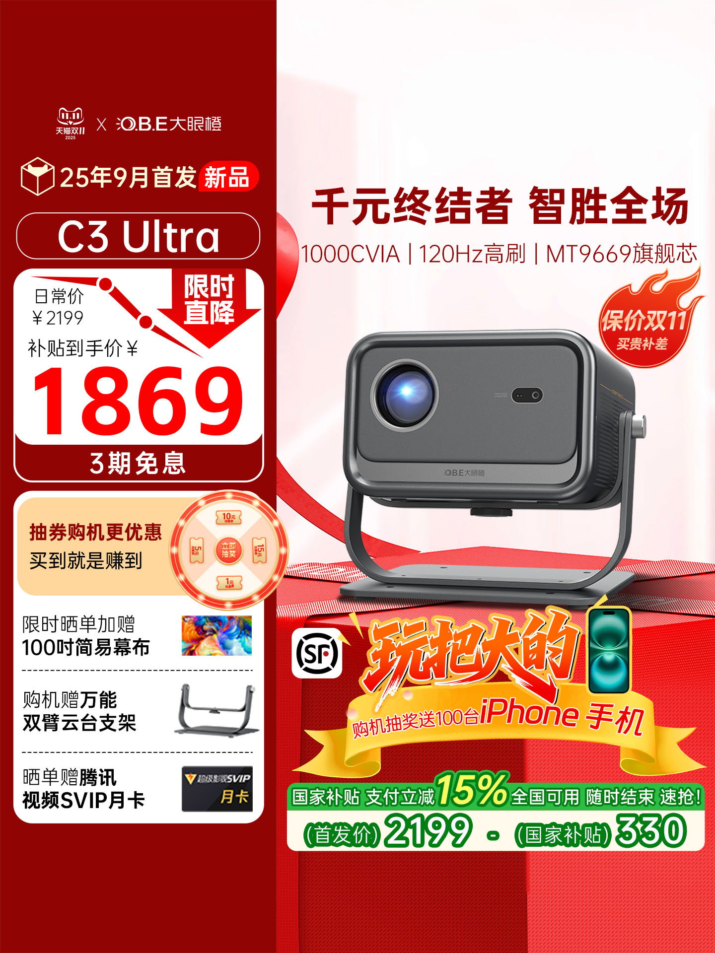 旗舰店【重磅新品全国补贴】大眼橙C3Ultra投影仪家用高清超亮高刷可连手机2025新款卧室放映机1080P无需幕布投屏墙