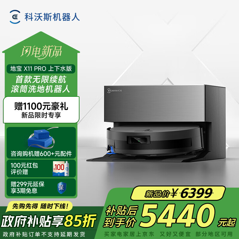 旗舰店科沃斯X11 PRO扫地机器人国家补贴洗地机七夕情人节礼物扫拖一体自动清洗全自动上下水洗拖吸一体 黑银色-上下水版