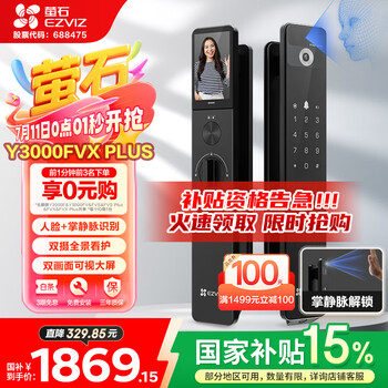 自营萤石Y3000FVX Plus智能锁 3D人脸识别支持掌静脉无需指纹 双摄双画面可视 家用全自动猫眼门铃视频门锁