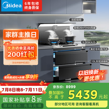 自营美的(Midea)【晴空FD90】消毒款 集成灶一体式 26风量油烟机 蒸汽洗 5.2kW燃气灶 消毒柜 国家补贴 家用灶具