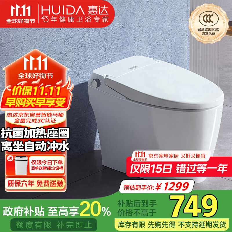 自营惠达(HUIDA)智能马桶家用抗菌座圈加热无水箱离座冲水HDZA-K69