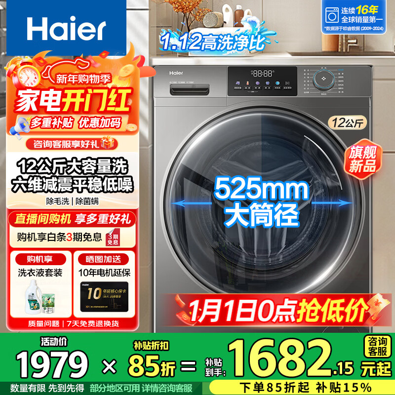 旗舰店海尔洗衣机12公斤滚筒大容量家用洗衣机大筒径超薄机身除菌螨一级能效L50DS洗衣机全自动国家补贴20% 12公斤洗脱一体:525大筒径+1.12高洗净比