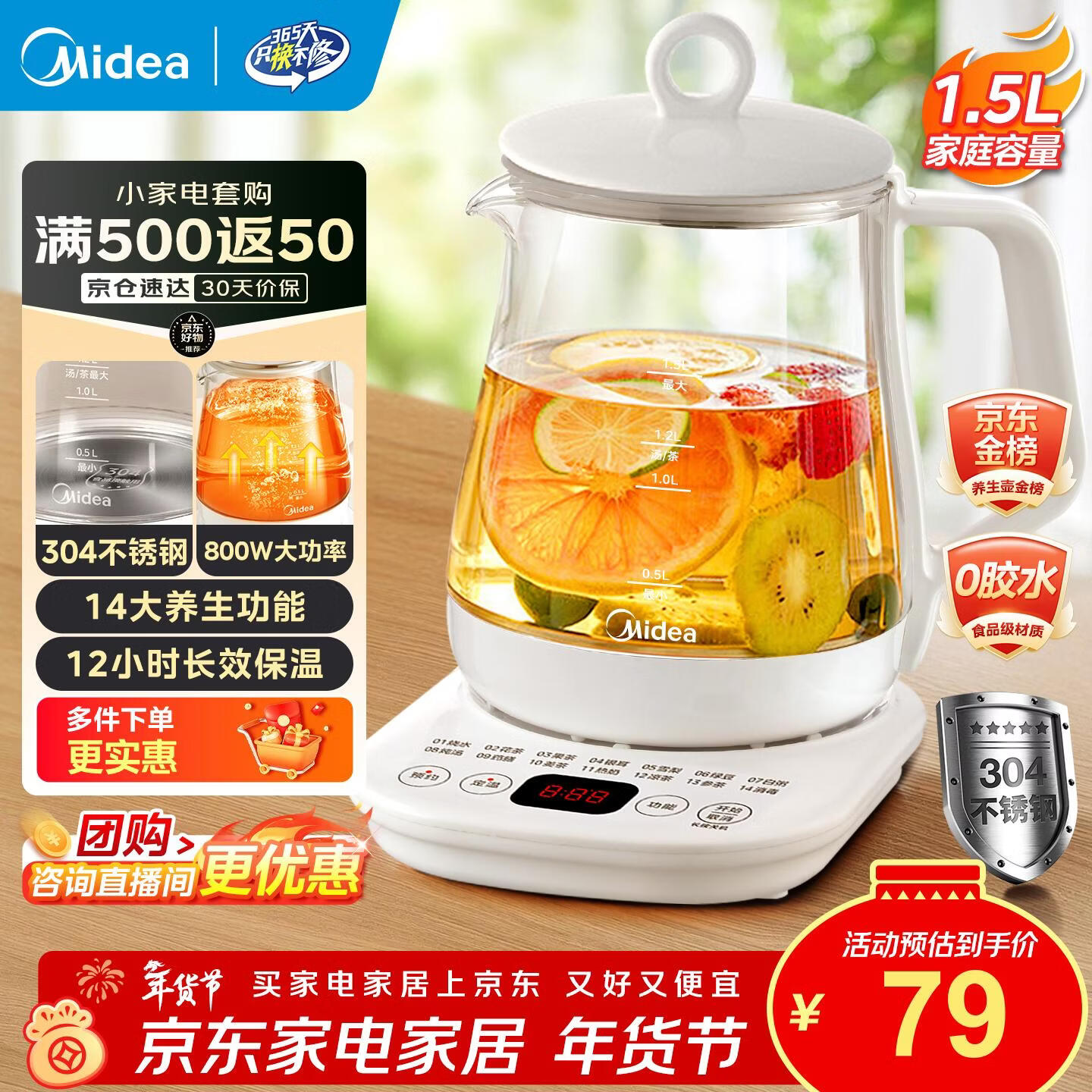 旗舰店美的(Midea)养生壶大容量 煮茶器智能预约1.5L烧水壶 恒温煮茶壶 办公室电水壶 花茶壶 【店铺力荐】14大养生功能12Q 1.5L
