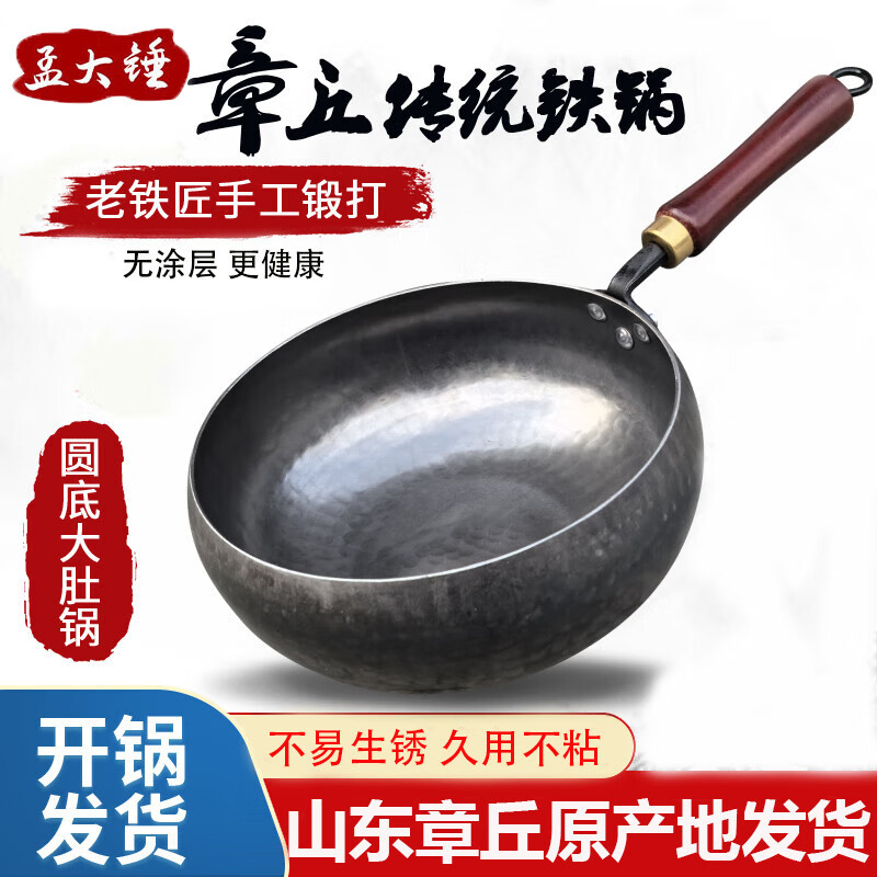旗舰店孟大锤正宗章丘大肚锅铁锅新款手工锻打熟铁锅无涂层不易粘锅家用炒菜锅 镜面款大肚锅【单锅】 22cm