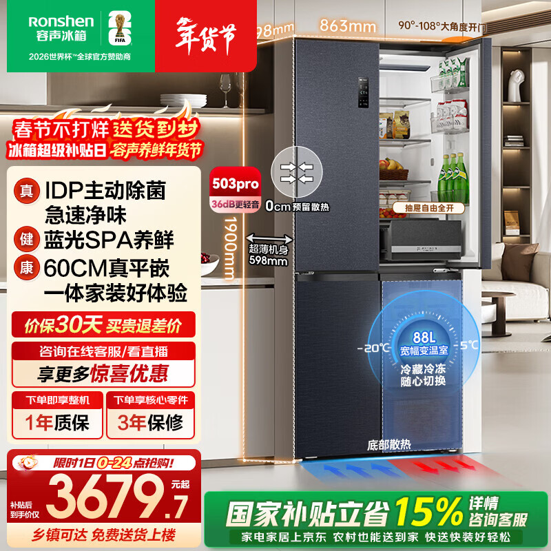 自营容声IDP净味503L十字门冰箱pro款主动除菌超薄嵌入一级能效风冷无霜大容量BCD-503WD15FPQLA灰国家补贴