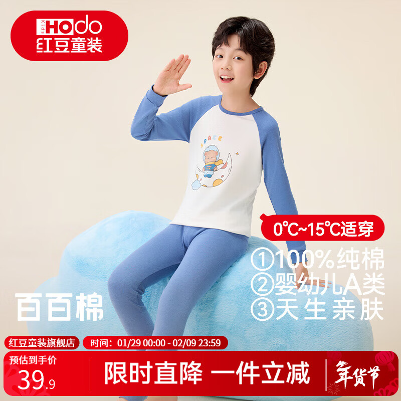 百亿补贴红豆儿童纯棉秋衣秋裤男女中大童内衣套装薄款小孩保暖棉毛衫A类睡衣 H5M1113蓝灰 150